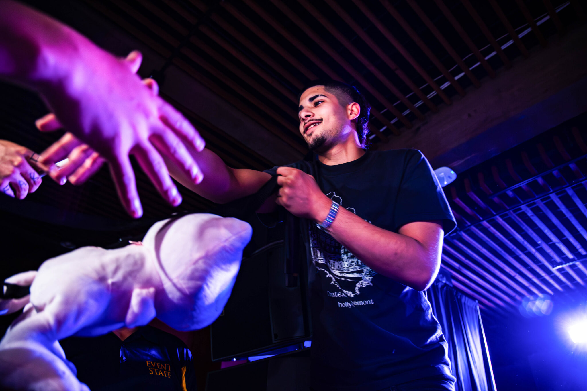 A few minutes later, the king of the UK underground himself emerged through the gap in the curtains behind D33J, casually fitted in a black Chateau Marmont hotel T-shirt and black jeans, with a plush Pokémon Mew backpack on one shoulder. He started the night off strong with popular track “Easter Pink,” which was met with roars of excitement as the crowd surged forward against the barricade, suddenly sounding very British as they screamed along to the euphoric electronic beat: “They stealin’ my flow and they stealin’ my drip.”