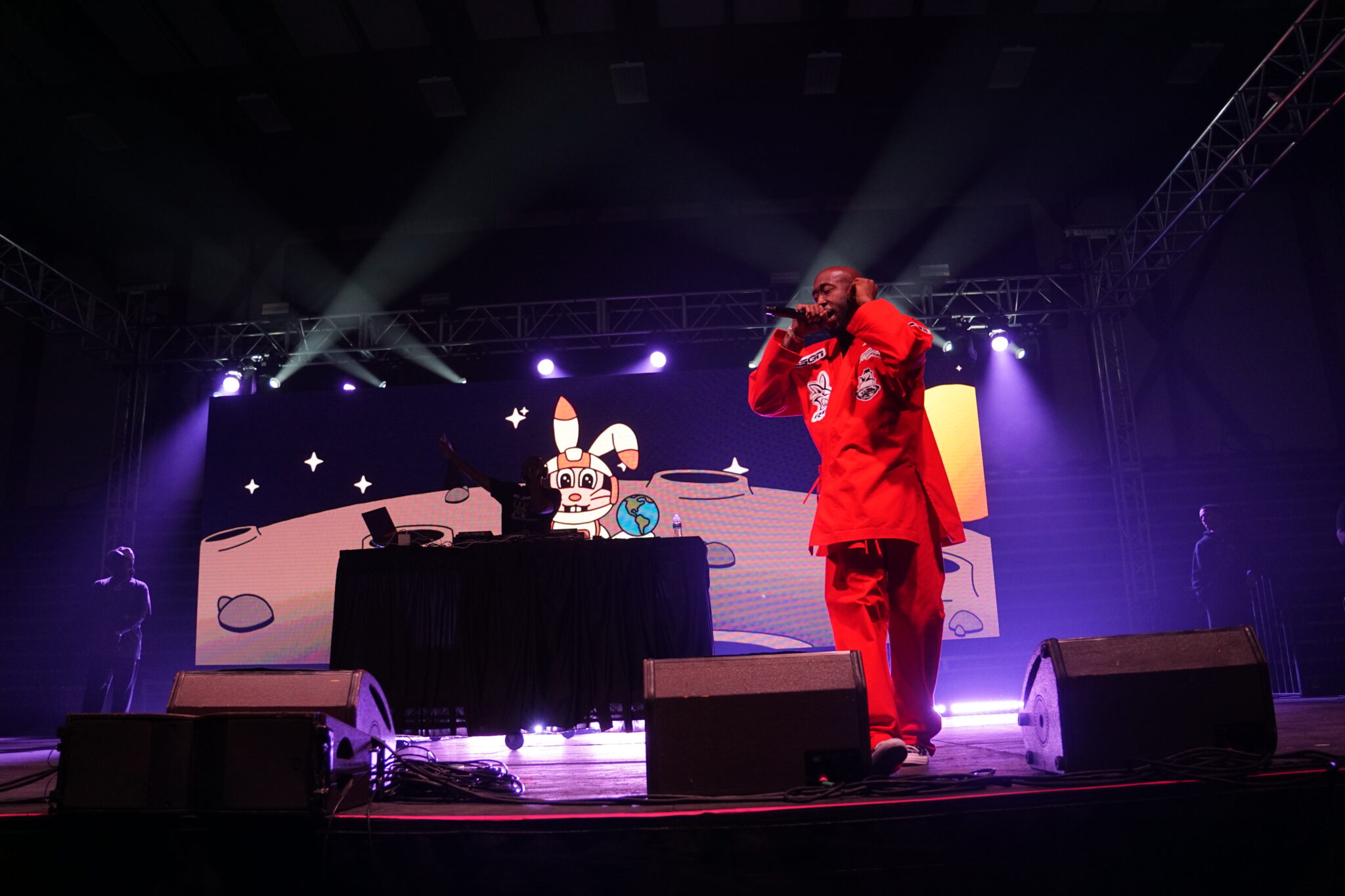 The impatient students didn’t have to wait much longer as Gibbs hit the stage around 9:15 p.m., striding out in a bright orange karate-style uniform and shouting, “Santa Barbara, what’s up!” He launched straight into “1985,” a psychedelic-rock infused track produced by The Alchemist, setting the tone with razor-sharp delivery that reverberated through the Thunderdome.