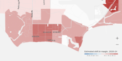In 2020, Trump failed to gain more than 9% of the vote in any Isla Vista precinct, with his best performance being in the 65/66 block of Isla Vista. Meanwhile in 2024, Trump managed to beat this margin in almost every I.V. precinct with his best performance being in the 67/68 blocks.