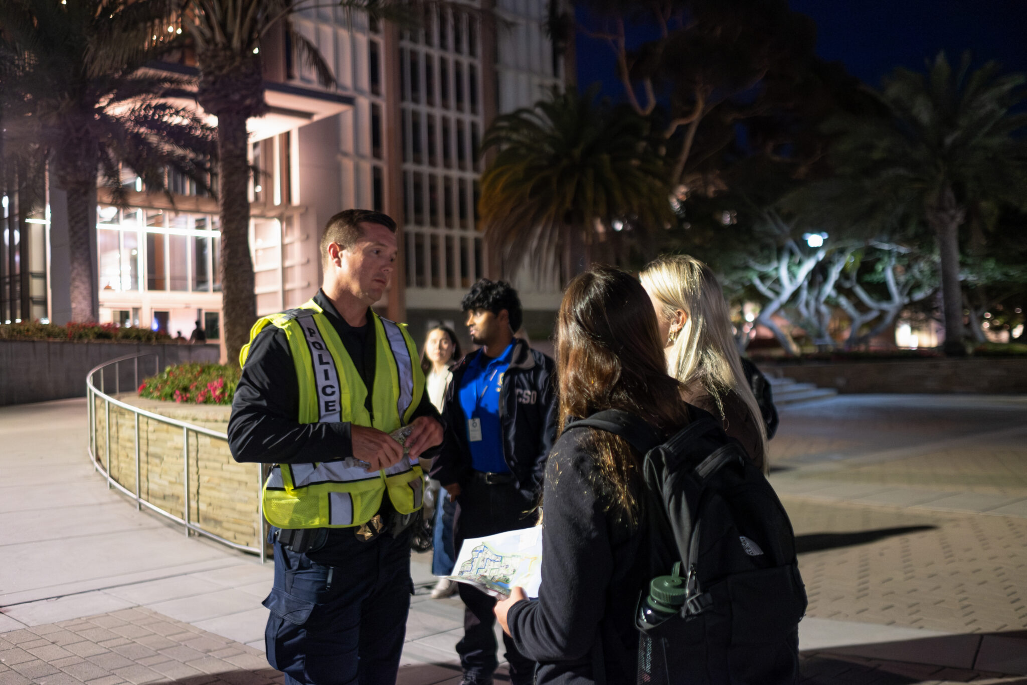 Roughly 30 attendees from organizations, including the Associated Students (A.S.) Senate, UCSB Facilities Management, UCSB Housing, Dining & Auxiliary Enterprises, UCSB Communications Services, A.S. Take Back the Night and UCSB Student Affairs met with organizers by the Arbor to learn how the walks would work. UCPD Corporal Ariel Bournes then instructed attendees to split into four groups to walk the different routes, including near the lagoon, west campus, north campus and east campus.