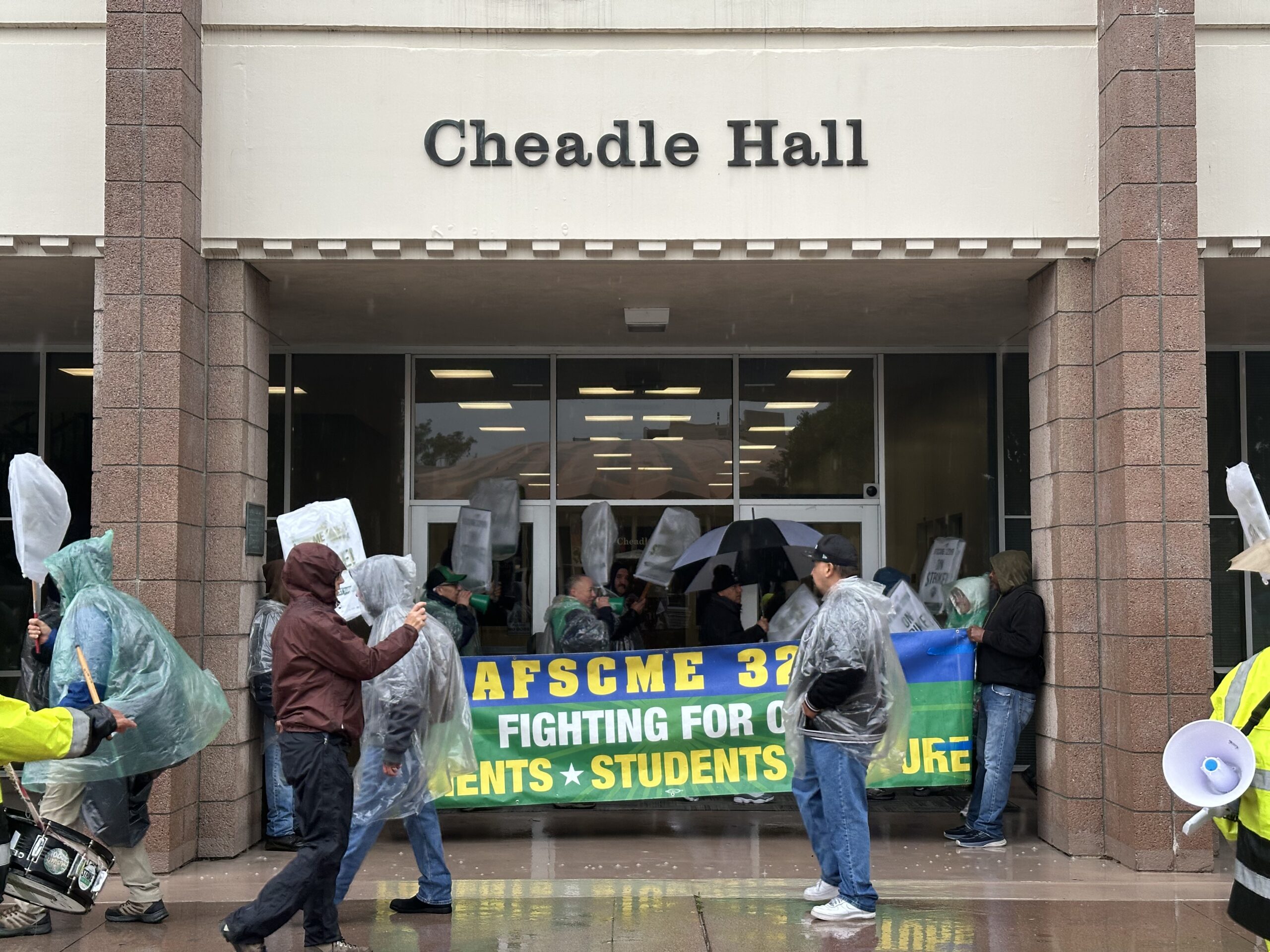 Despite rainy conditions, AFSCME 3299 started rallying across campus at 8 a.m. on Monday, Nov. 17. The strikers made their way to Cheadle Hall and eventually entered the building where AFSCME executive board member and groundskeeper at UCSB, Serafin Zamora, instructed workers not to use bells or megaphones, as he said remaining respectful was a “good chance” to show UCSB’s new chancellor, Dennis Assanis, “why [AFSCME 3299] is here.”