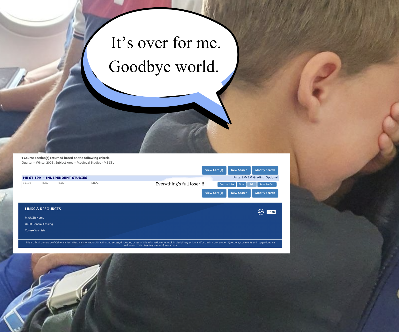 First-year medieval studies major, Finbar O’Flanagan, is the latest victim of the class shortage at UCSB and has recently announced the end of his academic career. In a statement issued to the entirety of the school via a Gmail chain, O’Flanagan decried the school and expressed his shock about the situation.