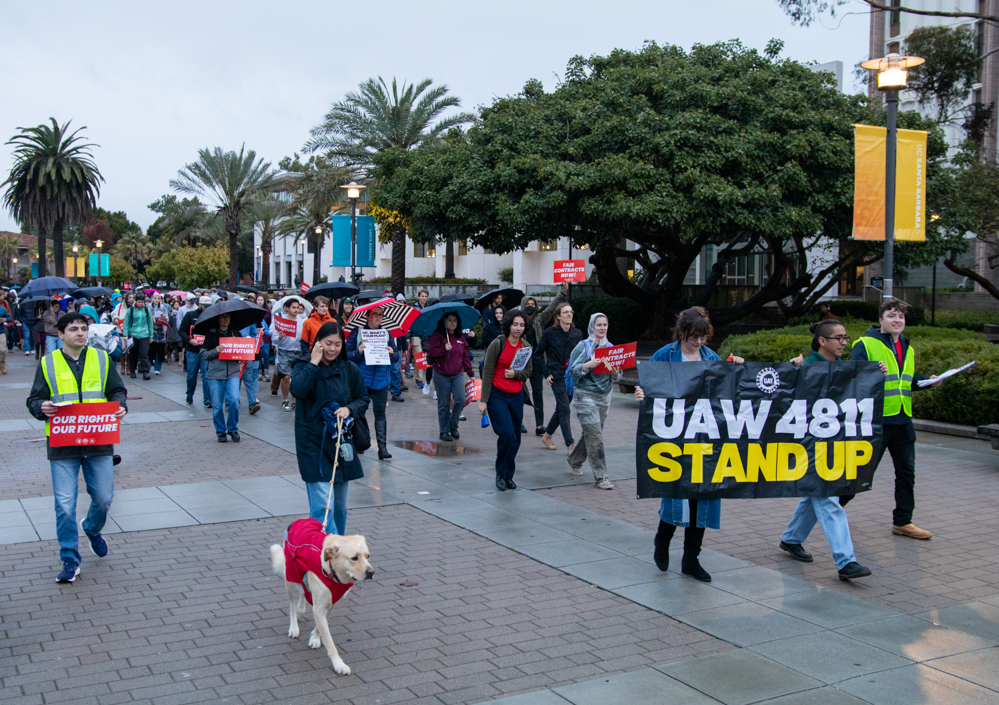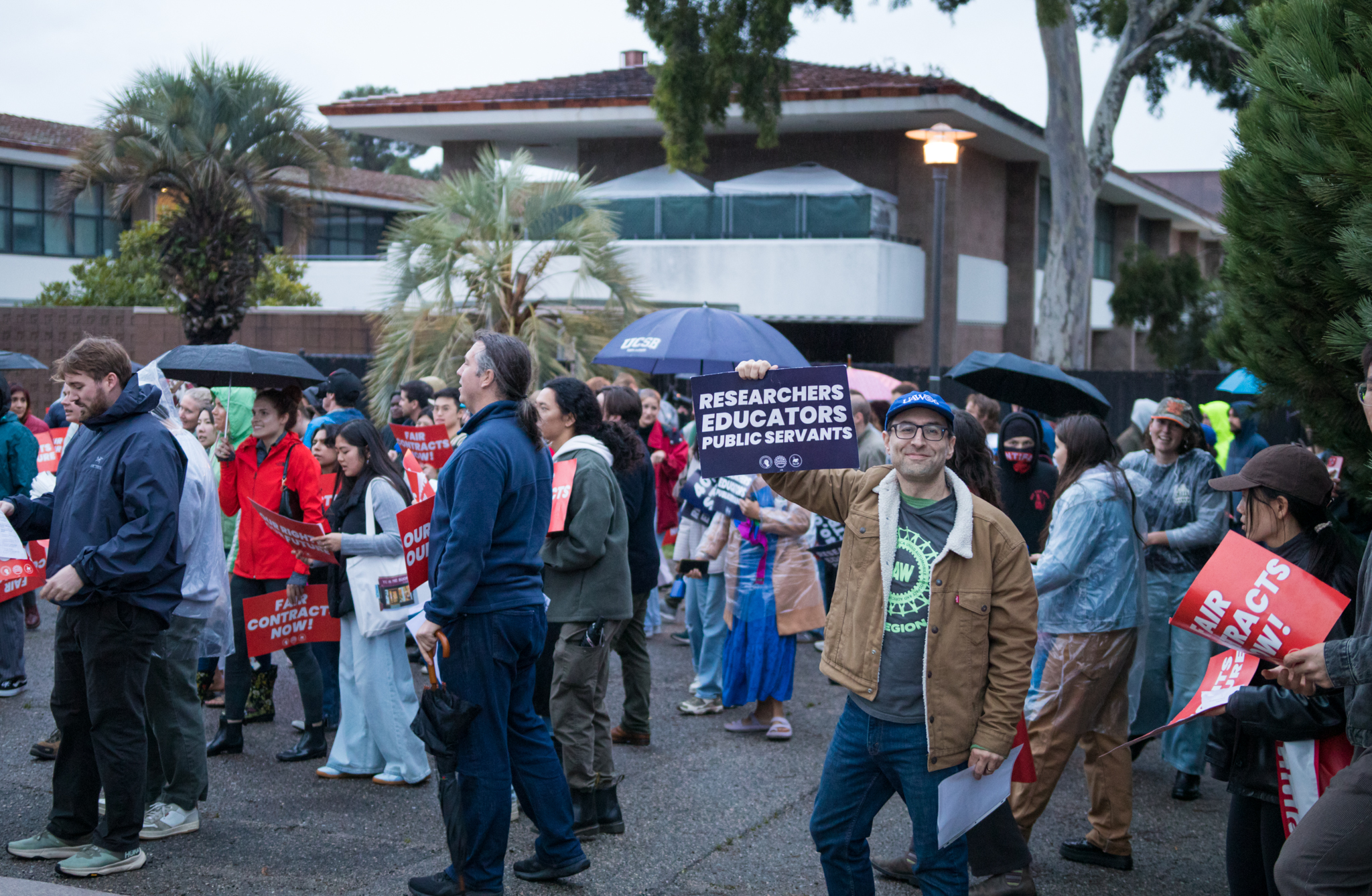 Workers across the University of California rallied on Nov. 20 ahead of upcoming contract negotiations. At UC Santa Barbara, roughly 60 workers and community members equipped with rain jackets and signs rallied at the Arbor walkway.