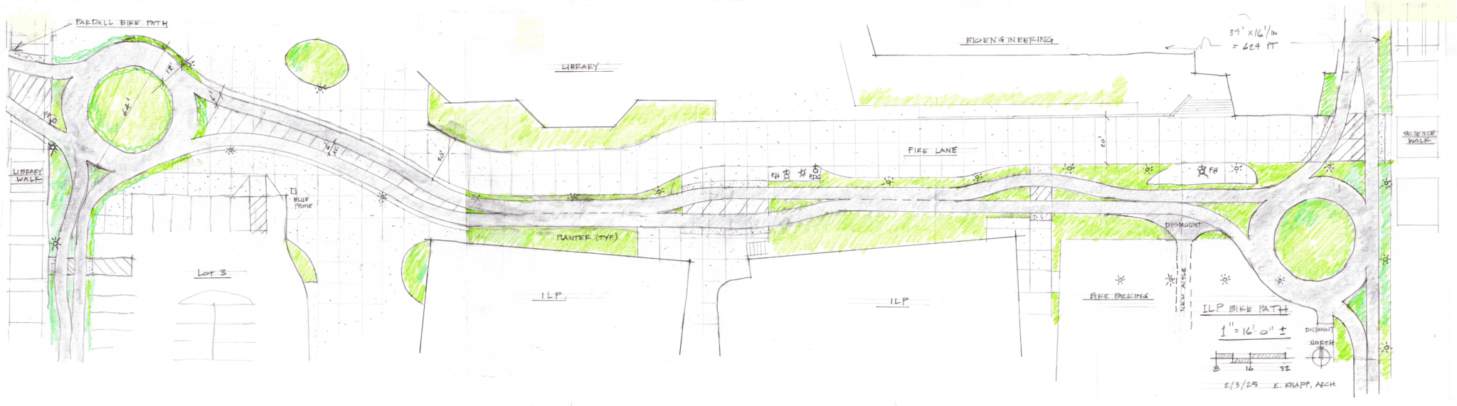 The path’s plan includes two roundabouts, one near the MultiCultural Center and the other by the current ILP bike parking lot. The path will run along the south side of the corridor between the library and ILP where there are currently planters, so the width of the walking path will be unchanged.
