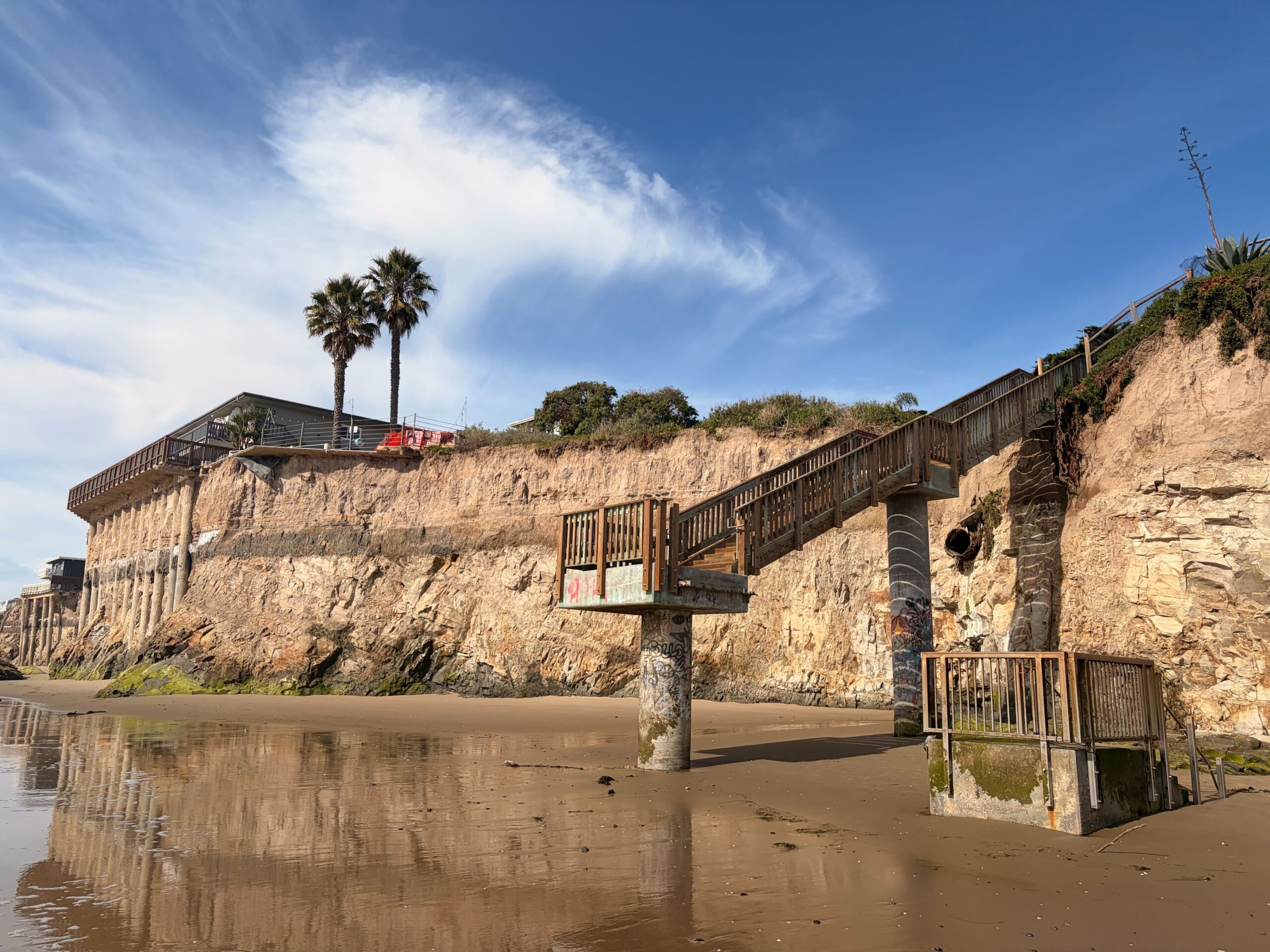 Powerful atmospheric river storms, such as those between Dec. 23 and Jan. 4, caused bluff erosion adjacent to the stairs, as well as visible damage to the cliffs supporting many homes along ocean-side Del Playa Drive. The ongoing effects of climate change have also accelerated coastal erosion, creating growing concerns about bluff safety in the community.