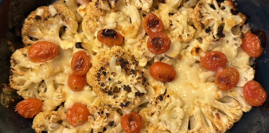 Be mindful of coating everything evenly in olive oil, even the tomatoes, as they may burn and crisp beyond repair if not treated right. You can also leave the dish in the oven for a longer or shorter period of time depending on how you want your cauliflower. Leave it in longer for a more smoky, burnt taste (though, be careful not to blacken it all together!) or shorten the baking time for a lighter and more refreshing profile.