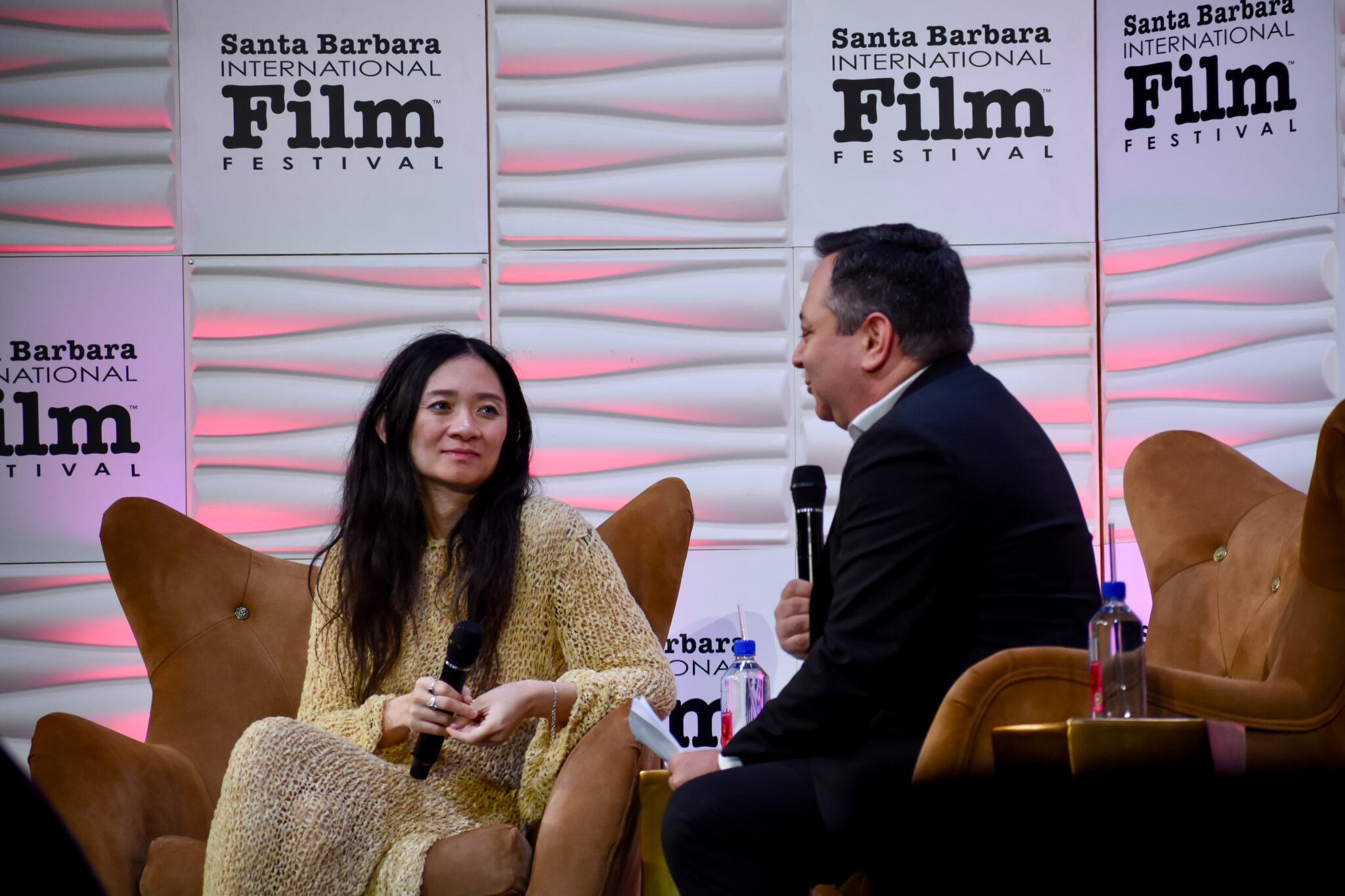 Chloé Zhao talking with moderator Scott Feinberg. (Sara Stevens / Daily Nexus)