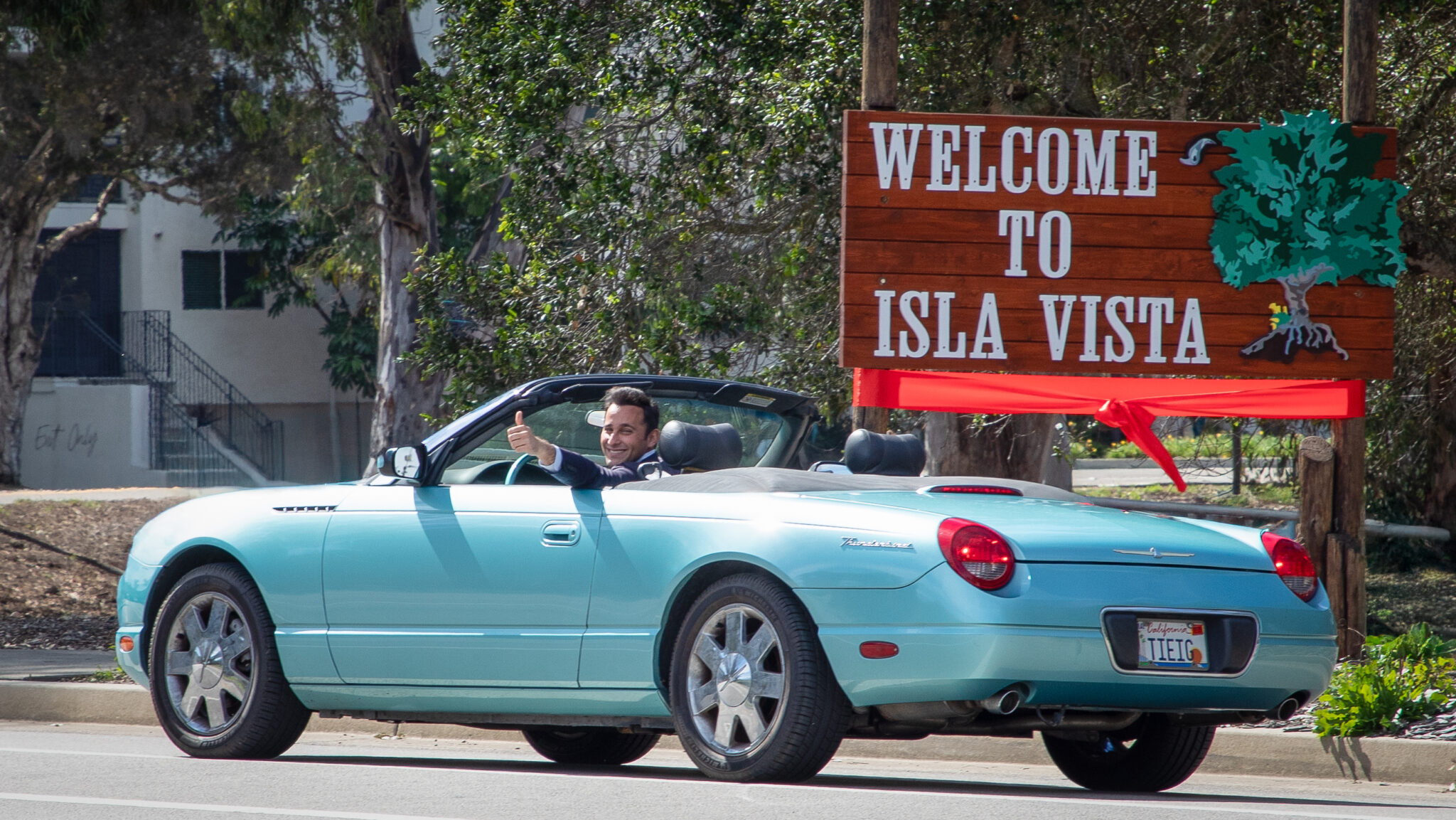 IVCSD General Manager Jonathan Abboud drives by the Welcome to Isla Vista sign. Courtesy of Brian Seitz