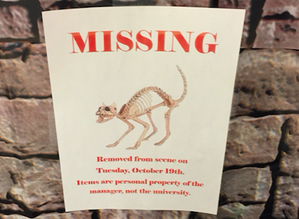 Ortega staff members have placed “missing” signs at the front desk, as well as the cat’s prior position in the Halloween scene.