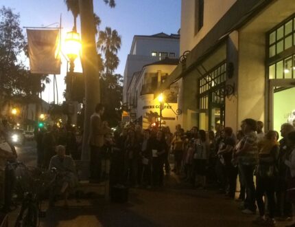 A group of activists proudly wearing “No Hate on State” stickers and “Just Be You” bracelets gathered Tuesday in De La Guerra Plaza.