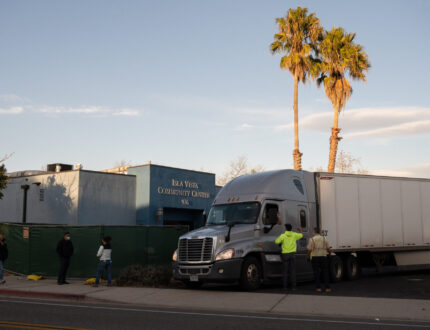 The 64-square-foot temporary homes were delivered by Pallet, a company that designs and produces aluminum composite shelters for people experiencing houselessness.