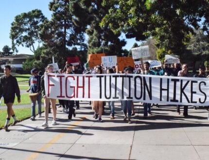 Members of the UCSB Student Activist Network called on students to walk out of class and assemble in front of Storke Tower Monday, passing out signs saying, “Hikes are for trails NOT tuition” and “You are not a-loan” as students assembled.